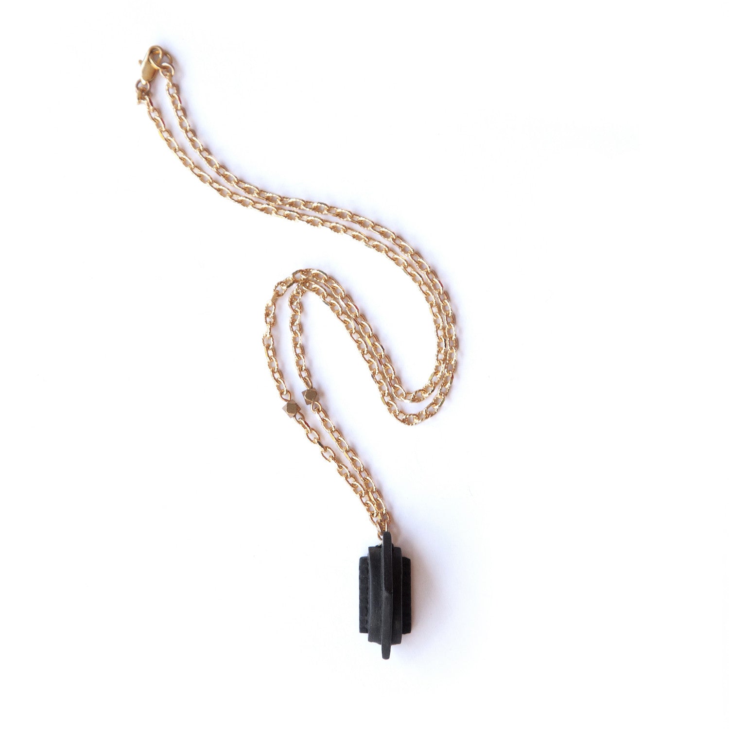 Stone-like jesmonite architectural forms, reminiscent of the remains of a grand temple, from an exotic lost city, hang on a short, sparkling engraved golden chain.