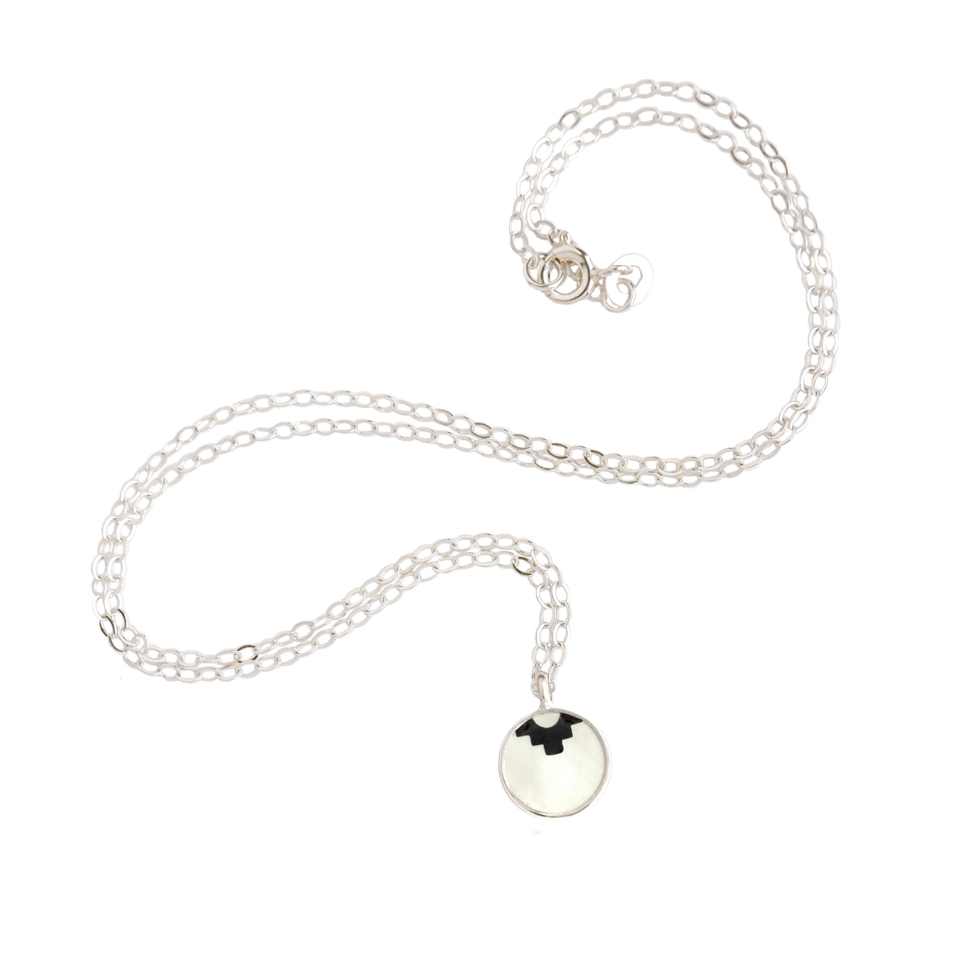 These little pearlescent artworks are framed by hand-crafted bezels, in fine & sterling silver, and hung from fine glistening chain.