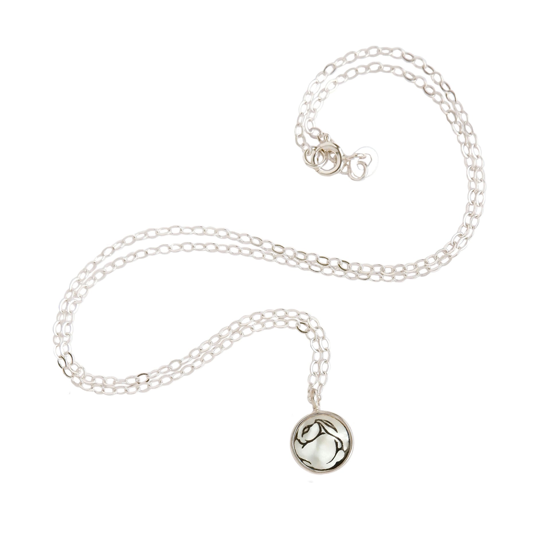 These little pearlescent artworks are framed by hand-crafted bezels, in fine & sterling silver, and hung from fine glistening chain.