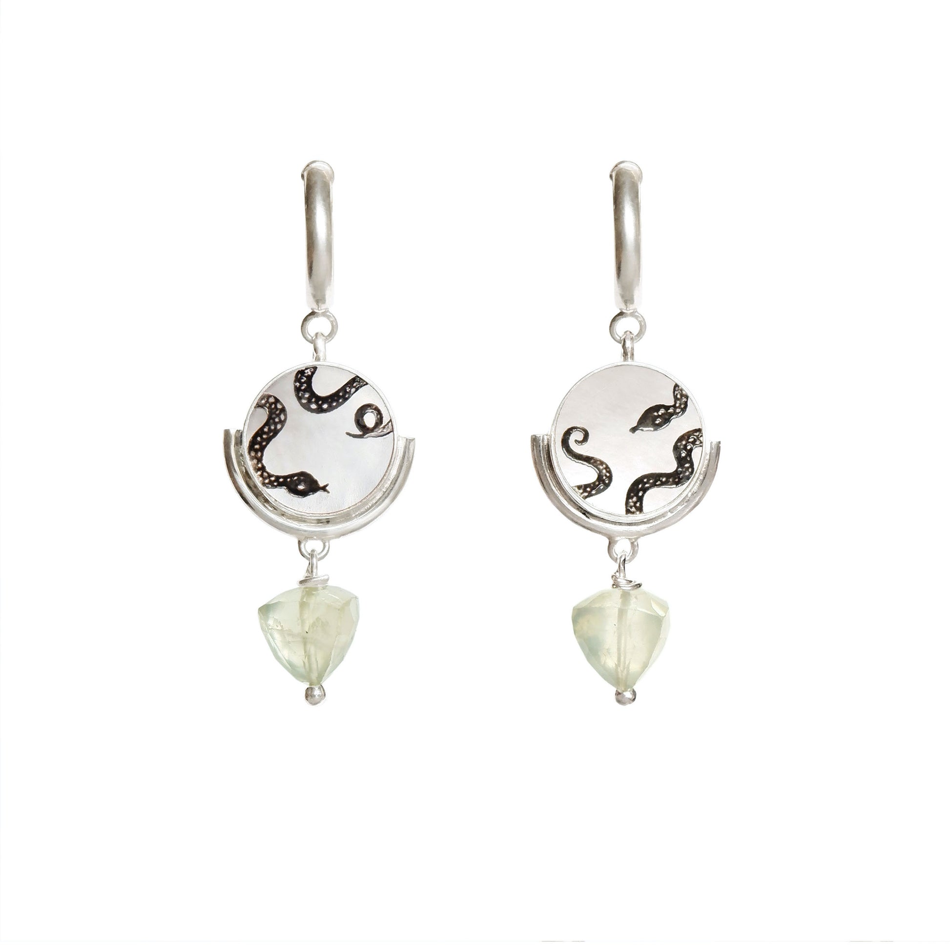 This pair is etched with serpents, symbolising new beginnings, and the shedding of old ways. They are adorned with pretty Prehnite pyramid charm.