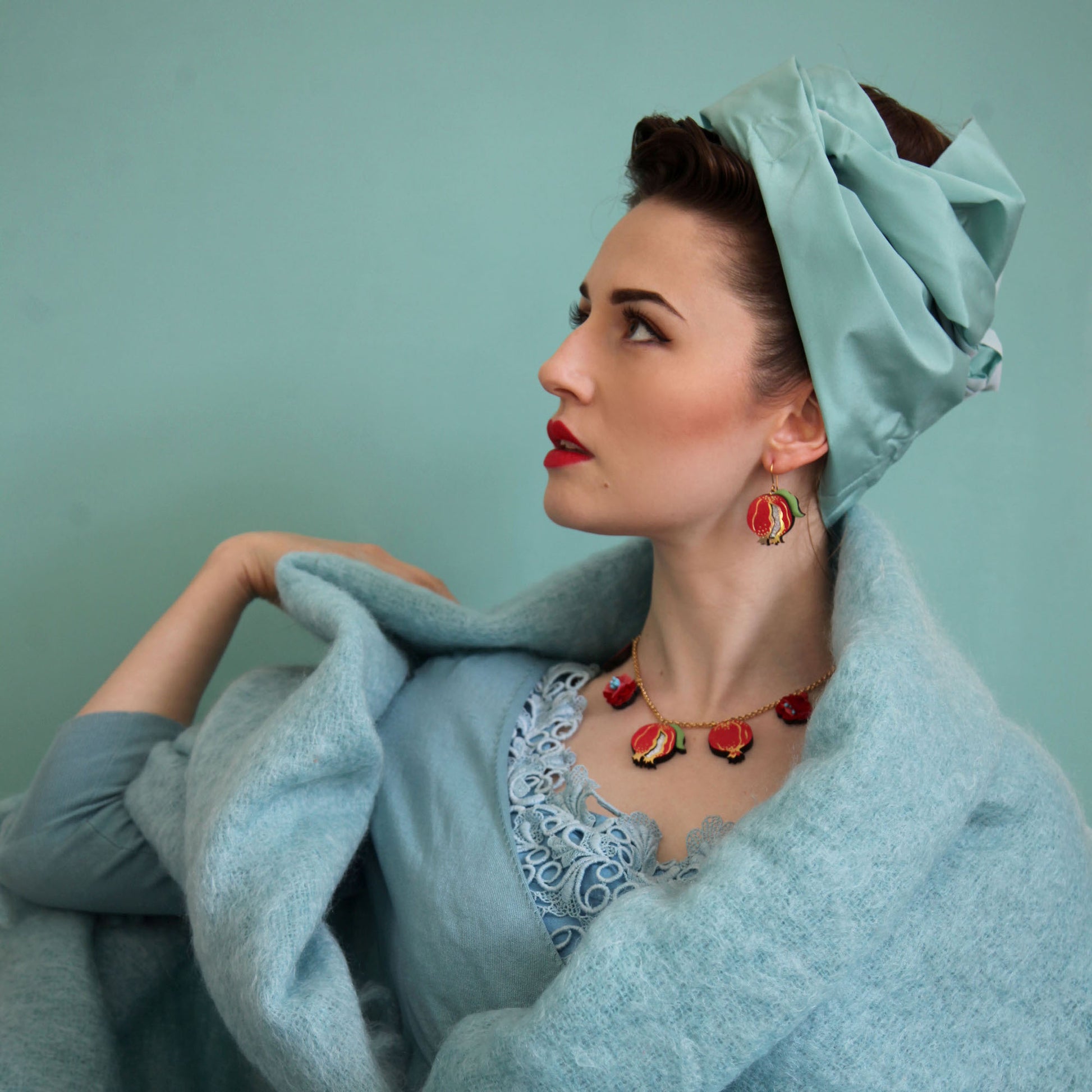 Created especially for a cultural exchange pop-up event in Hankyu Department Store, Osaka, this mini collection was designed in response to an "identity box' sent to me by my exchange partner, Japanese fashion brand RBTCXO. Amongst the pile of objects & ephemera in the box was a small dried pomegranate, a large stuffed patchwork banana, an iridescent vinyl wristband, some monochrome drawings of birds and a bag of assorted googly eyes. Though literally a mixed bag of components, I translated these motifs in to a collection of enchanted fruit adornments in a classic Rosita Bonita mould, but incorporated new-to-me materials to reflect RBTXCO's playful and textural designs. Natural meets unnatural, soft meets hard, matt meets high shine, beauty meets humour and tradition meets the future.