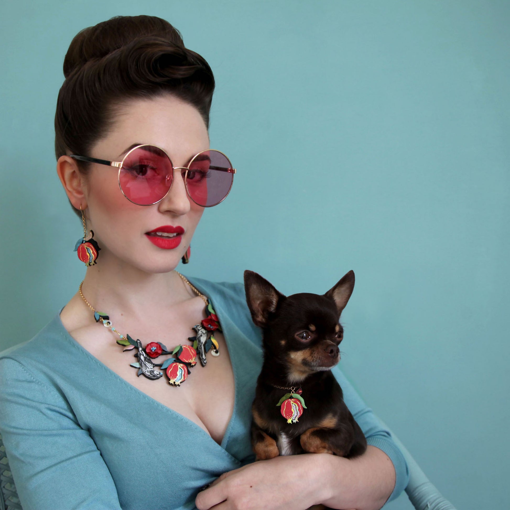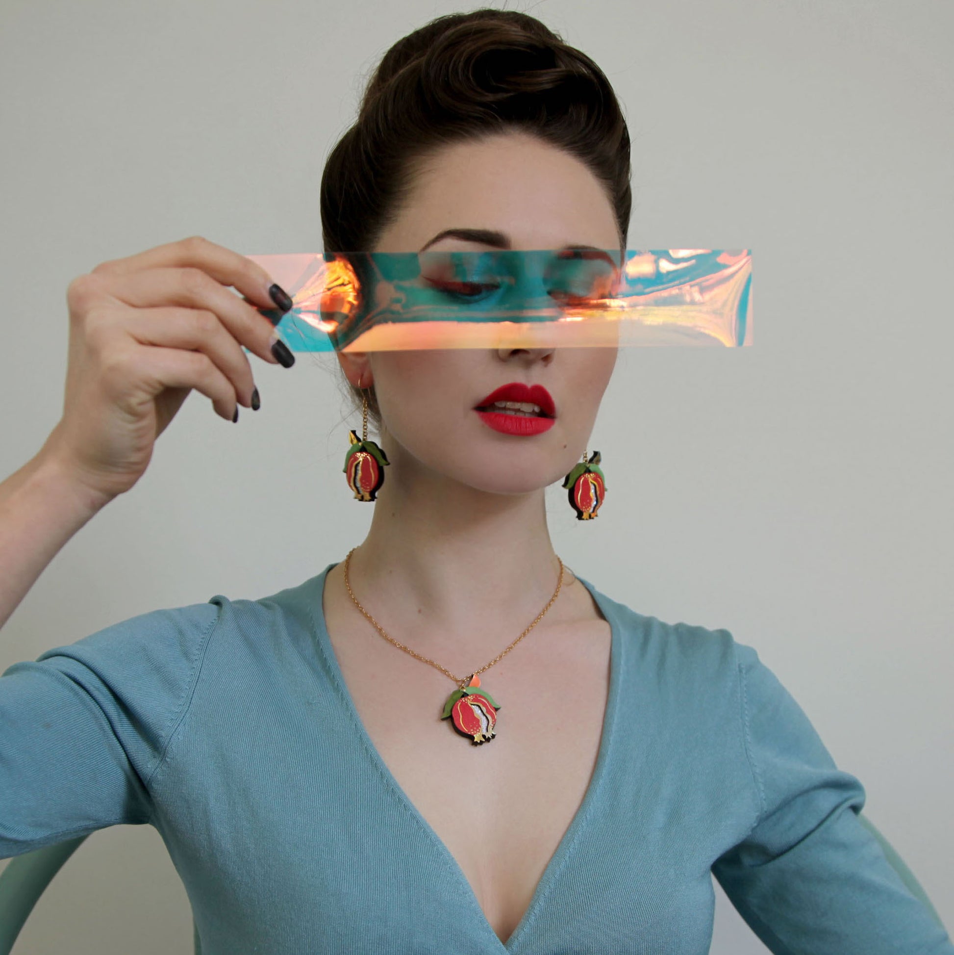 Created especially for a cultural exchange pop-up event in Hankyu Department Store, Osaka, this mini collection was designed in response to an "identity box' sent to me by my exchange partner, Japanese fashion brand RBTCXO. Amongst the pile of objects & ephemera in the box was a small dried pomegranate, a large stuffed patchwork banana, an iridescent vinyl wristband, some monochrome drawings of birds and a bag of assorted googly eyes. Though literally a mixed bag of components, I translated these motifs in to a collection of enchanted fruit adornments in a classic Rosita Bonita mould, but incorporated new-to-me materials to reflect RBTXCO's playful and textural designs. Natural meets unnatural, soft meets hard, matt meets high shine, beauty meets humour and tradition meets the future.