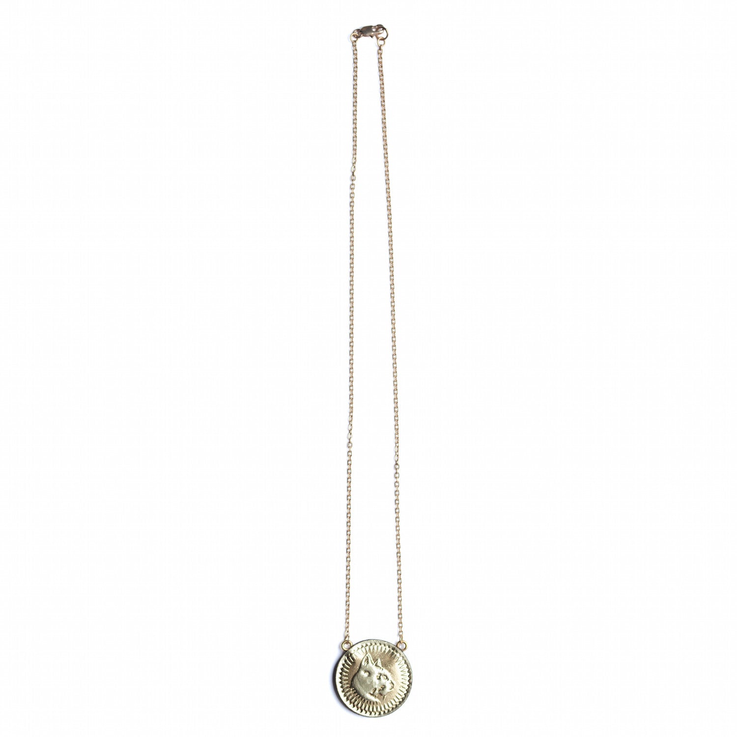 A simple gold leather coin is suspended from a fine glistening golden chain, foil-embossed with either a lucky cat or a lucky horseshoe & clover, the Orouboros (ancient symbol of eternity), or an Eye/Sunrise design.