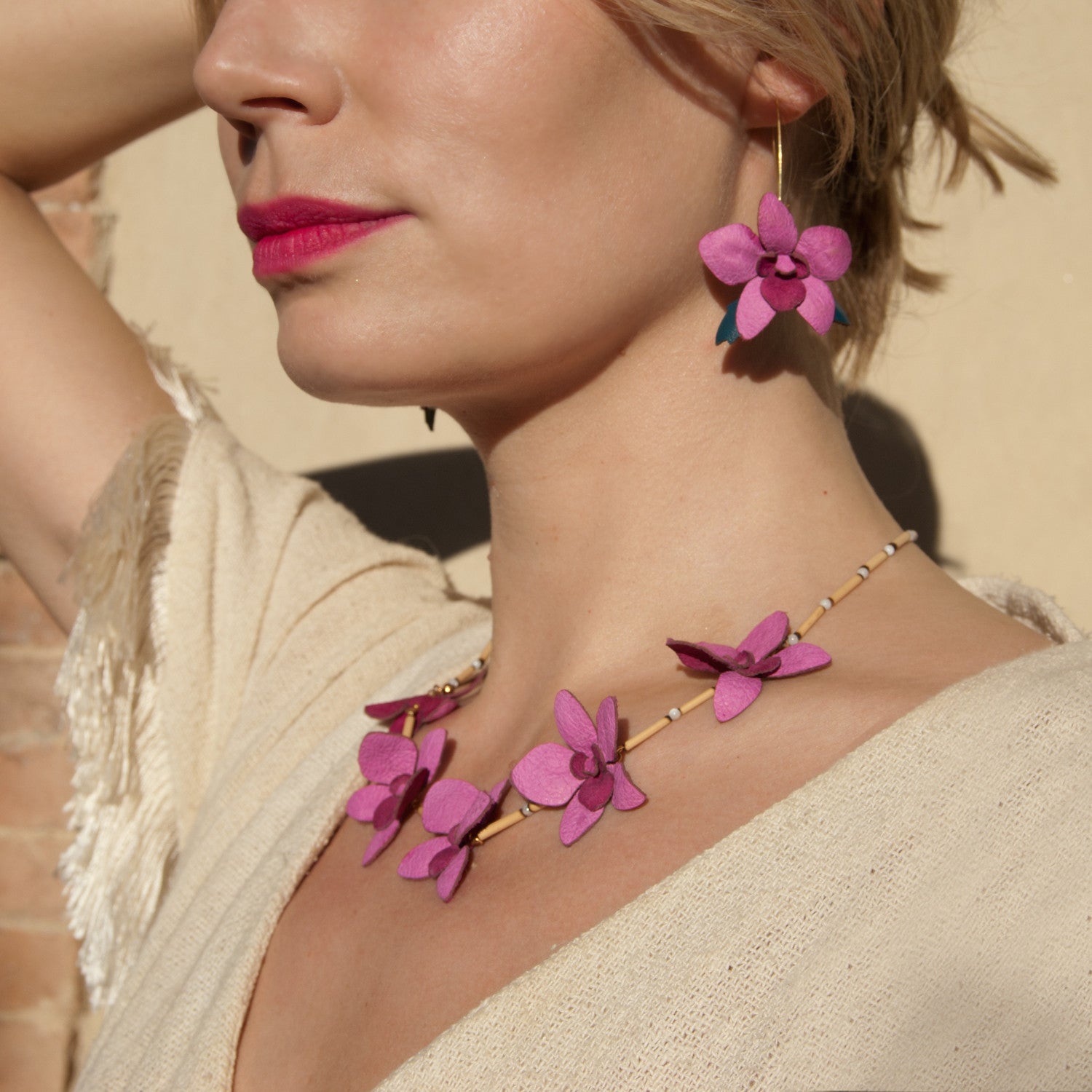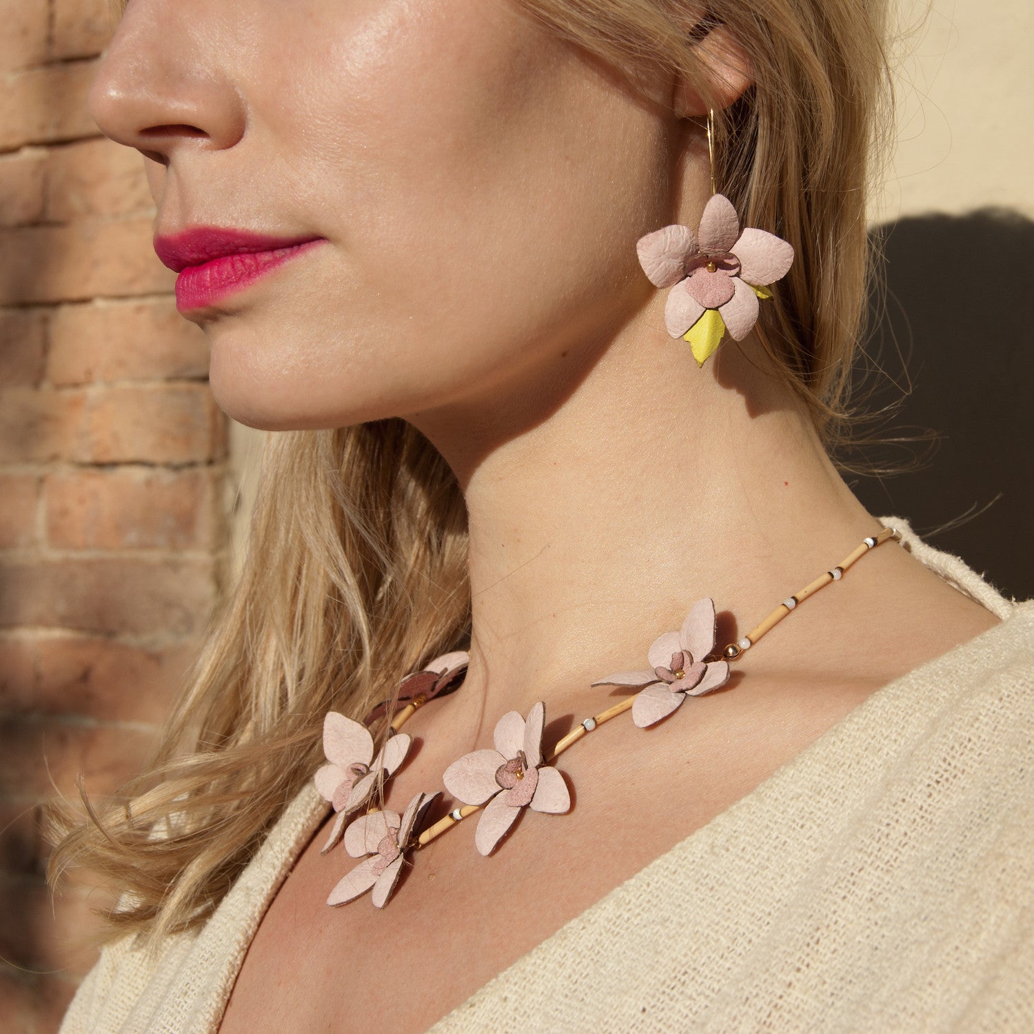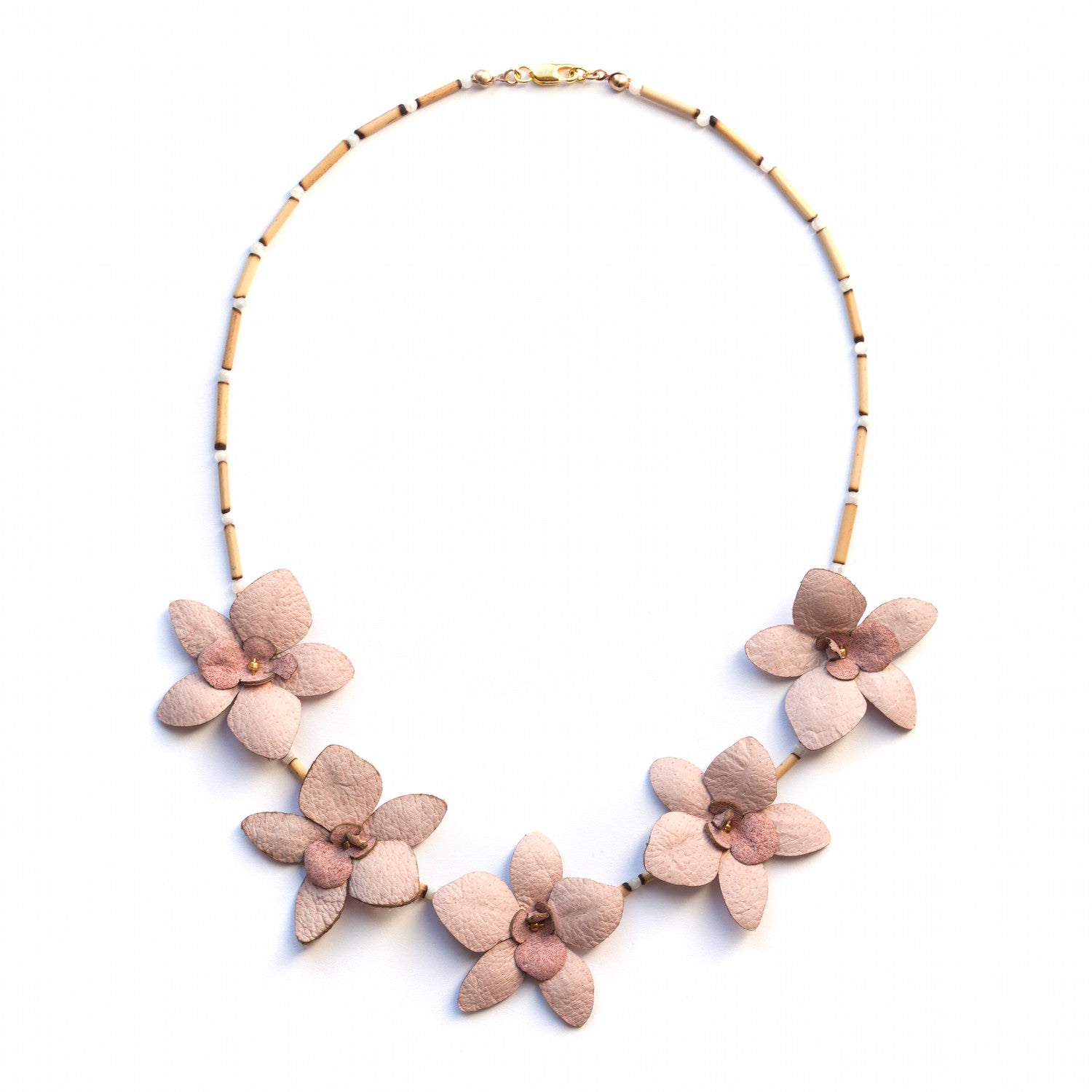 5 leather Orchids make a dainty necklet with natural bamboo & mother of pearl beads.