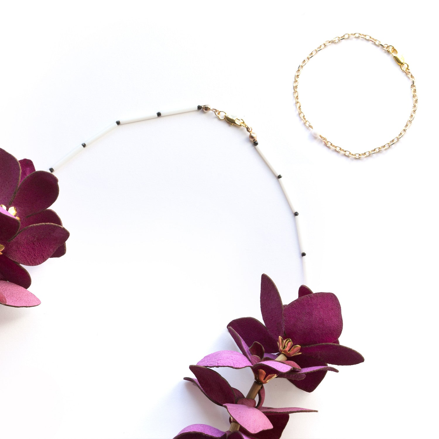 Each flower is laser cut from fine soft leathers, and each petal stiffened and individually formed, before being threaded with fine silk twine. The flower forms will soften slightly with wear to create a unique and organic look.