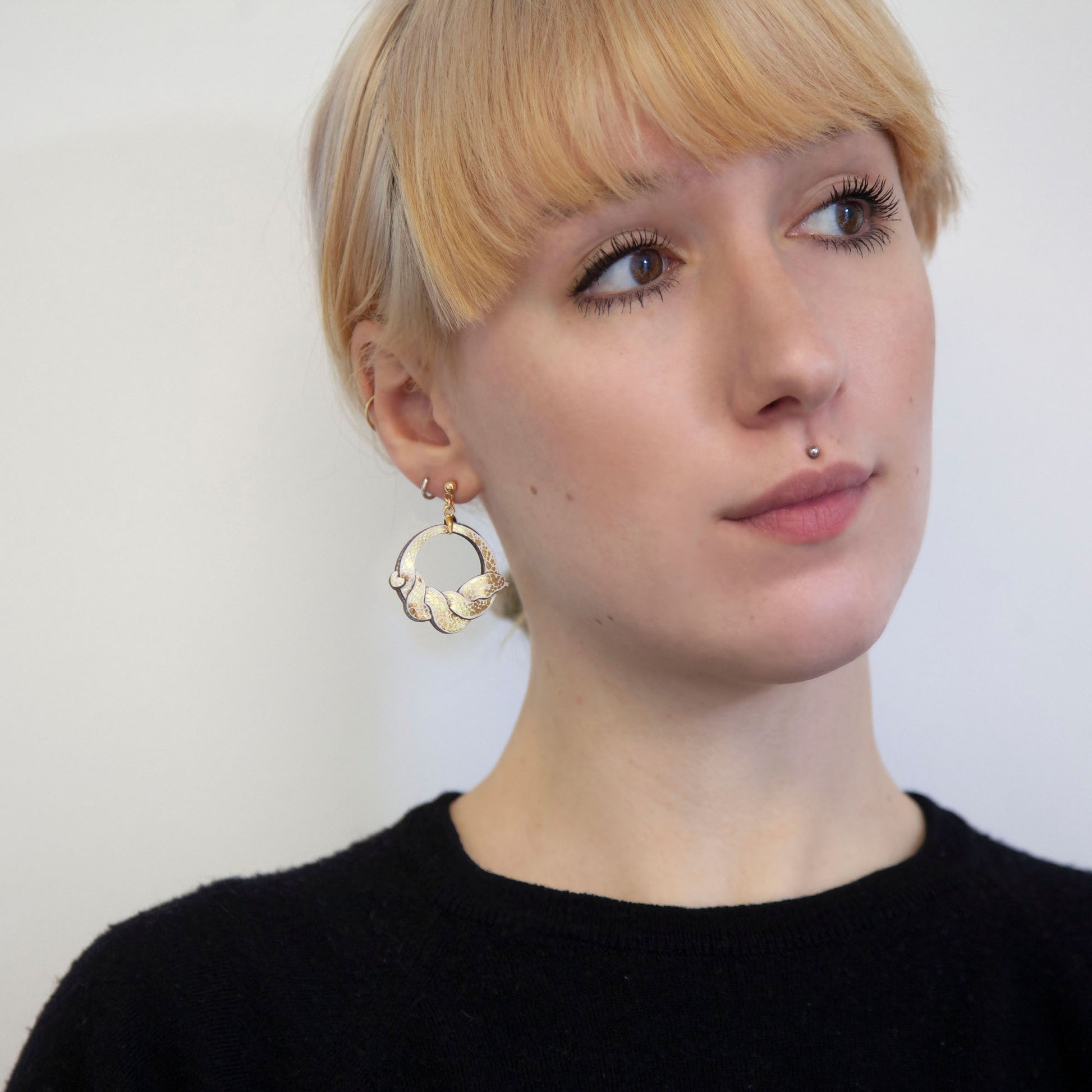Printed with shiny gold foil on to smooth saddlery leather or wood pulp textile, and layered to create a three dimensional twist, these little serpent hoops are super lightweight and endlessly wearable.