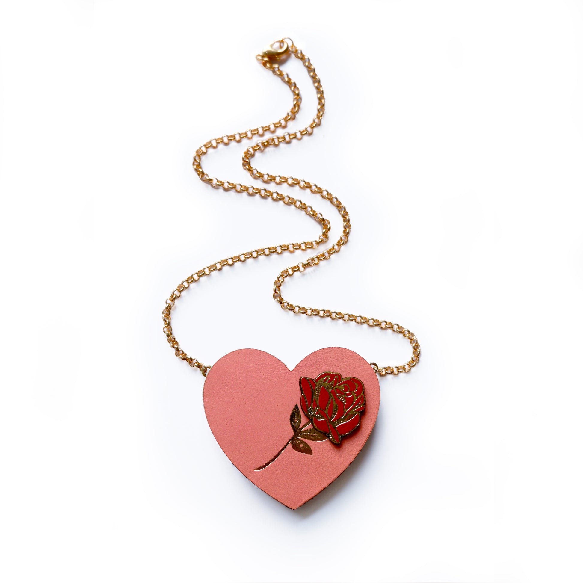 These pretty red roses are embossed with shiny gold foil on to smooth deep red leather, paired with saccharine pink hearts, then lovingly & carefully assembled in to a small collection of brooches, and neck wear.
